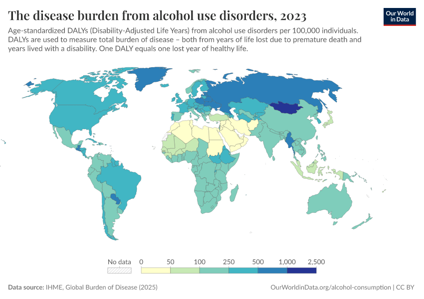 Measuring the health impact by mortality alone fails to capture the impact that alcohol use disorders have on an individual's well-being. The 'disease burden' – measured in Disability-Adjusted Life Years (DALYs) – considers mortality and years lived with disability or health burden. The map shows DALYs per 100,000 people, which result from alcohol use disorders.