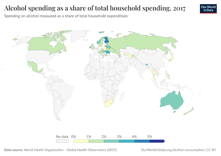 This interactive chart shows the average share of household expenditure that is spent on alcohol.