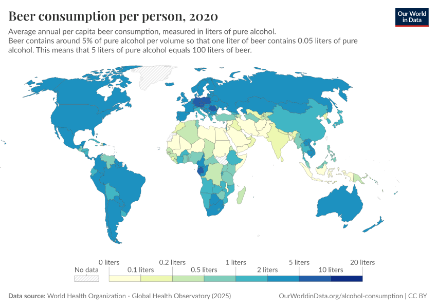 This interactive map shows the annual average alcohol consumption of alcohol, expressed per person aged 15 years or older. To account for the differences in alcohol content of different alcoholic drinks (e.g., beer, wine, spirits), this is reported in liters of pure alcohol per year.
