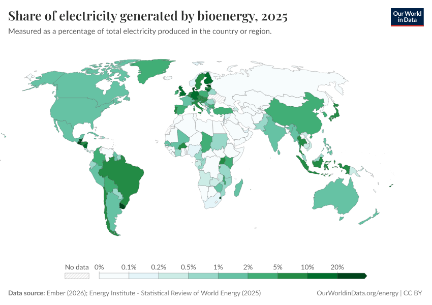 Some countries get a substantial share of their electricity from bioenergy. The map below shows the distribution across the world.