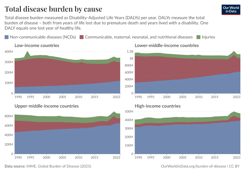 In high-income nations, non-communicable diseases account for a large share of the overall burden of disease. In contrast, communicable diseases tend to make a small share. This is shown below.