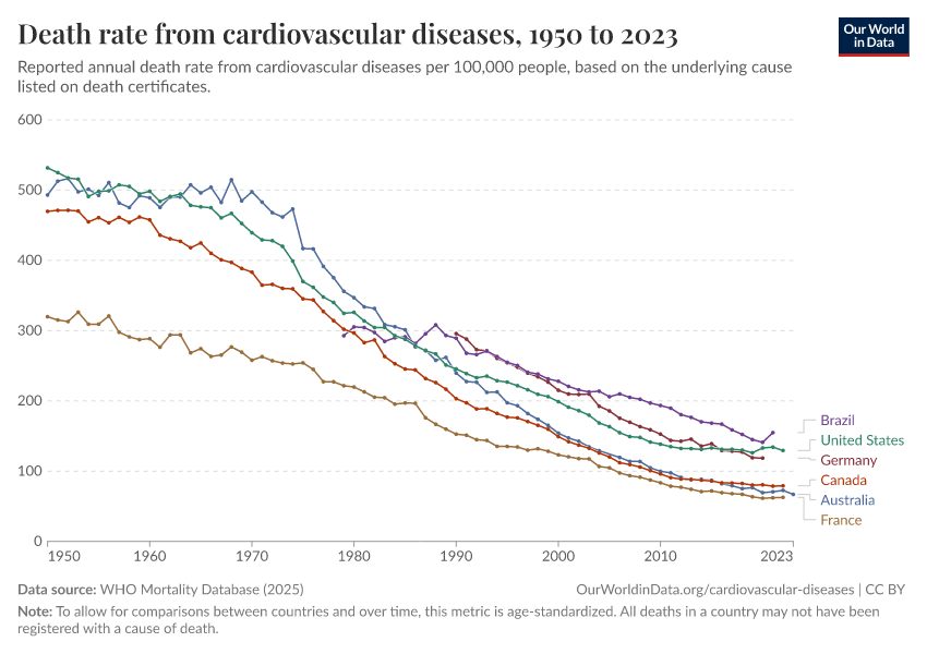 Saloni Dattani (2025) - “Death rates from cardiovascular disease have fallen dramatically — what were the breakthroughs behind this?” Published online at OurWorldinData.org. Retrieved from: 'https://chart-preview-extension.owid.pages.dev:8789/20260119-084543/cardiovascular-deaths-decline.html' [Online Resource] (archived on January 19, 2026).BibTeX citation