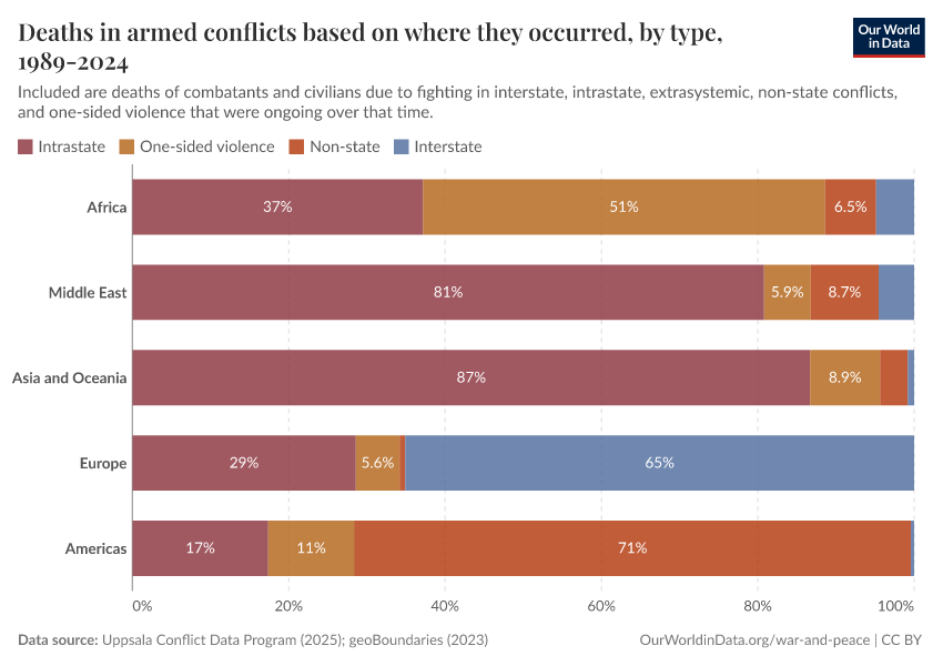 Bastian Herre (2024) - “Millions have died in conflicts since the Cold War; most of them in Africa and intrastate conflicts” Published online at OurWorldinData.org. Retrieved from: 'https://chart-preview-extension.owid.pages.dev:8789/20251125-173858/conflict-deaths-breakdown.html' [Online Resource] (archived on November 25, 2025).BibTeX citation