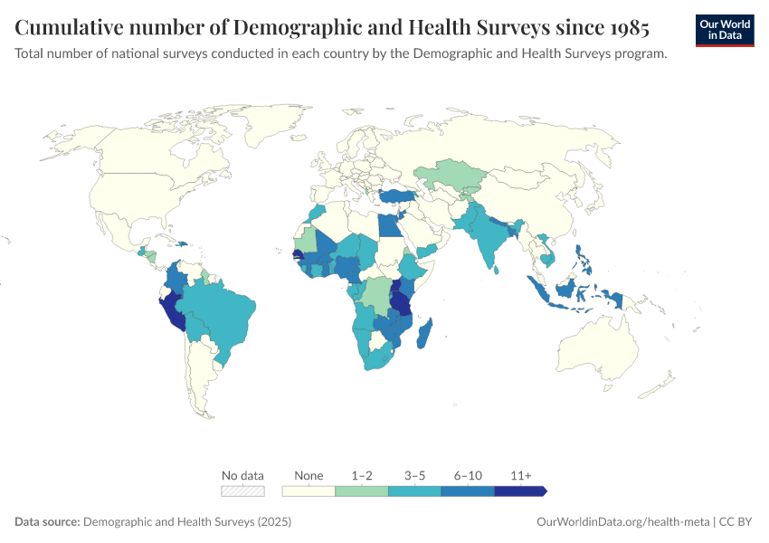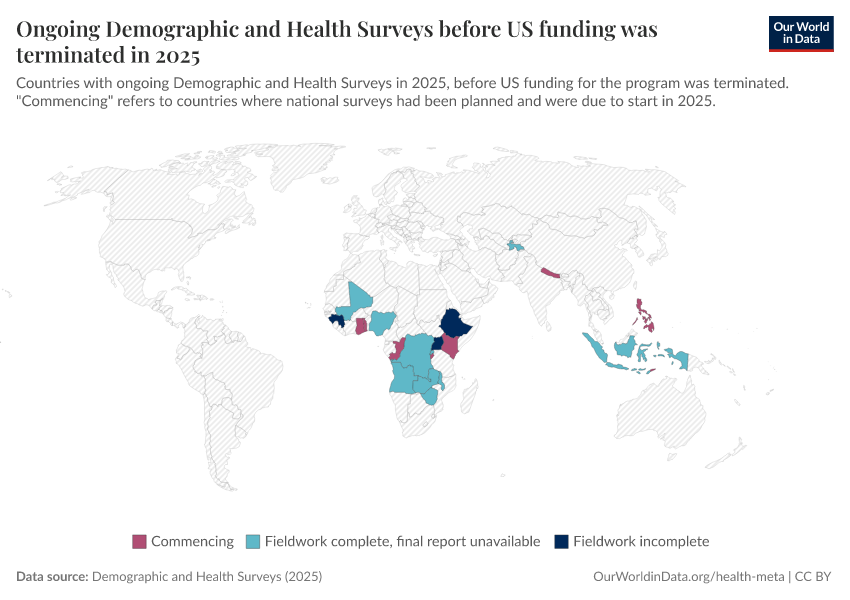 Saloni Dattani (2025) - “The Demographic and Health Surveys brought crucial data for more than 90 countries — without them, we risk darkness” Published online at OurWorldinData.org. Retrieved from: 'https://chart-preview-extension.owid.pages.dev:8789/20260212-063327/demographic-health-surveys-risk.html' [Online Resource] (archived on February 12, 2026).BibTeX citation
