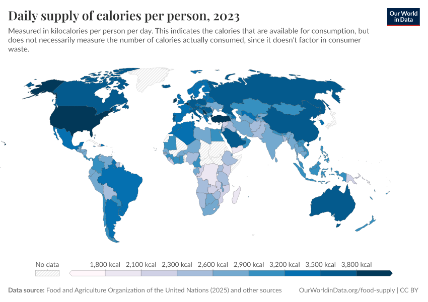 Max Roser, Hannah Ritchie, and Pablo Rosado (2013) - “Food Supply” Published online at OurWorldinData.org. Retrieved from: 'https://chart-preview-extension.owid.pages.dev/food-supply' [Online Resource]BibTeX citation