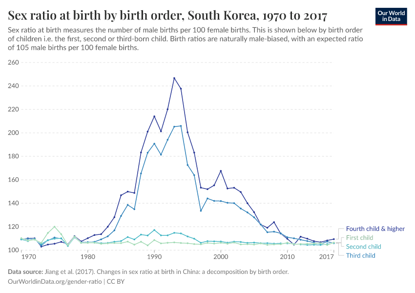 In this chart, we can see how the sex ratio in South Korea varies by birth order.