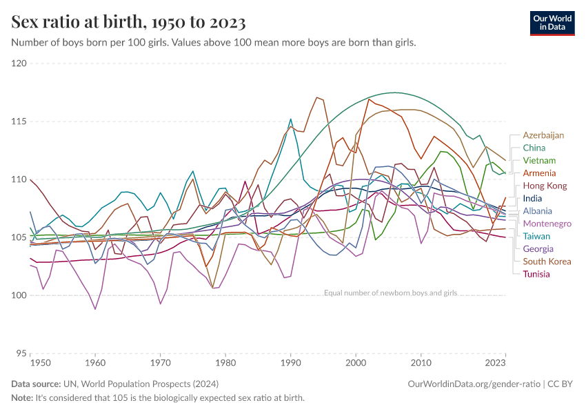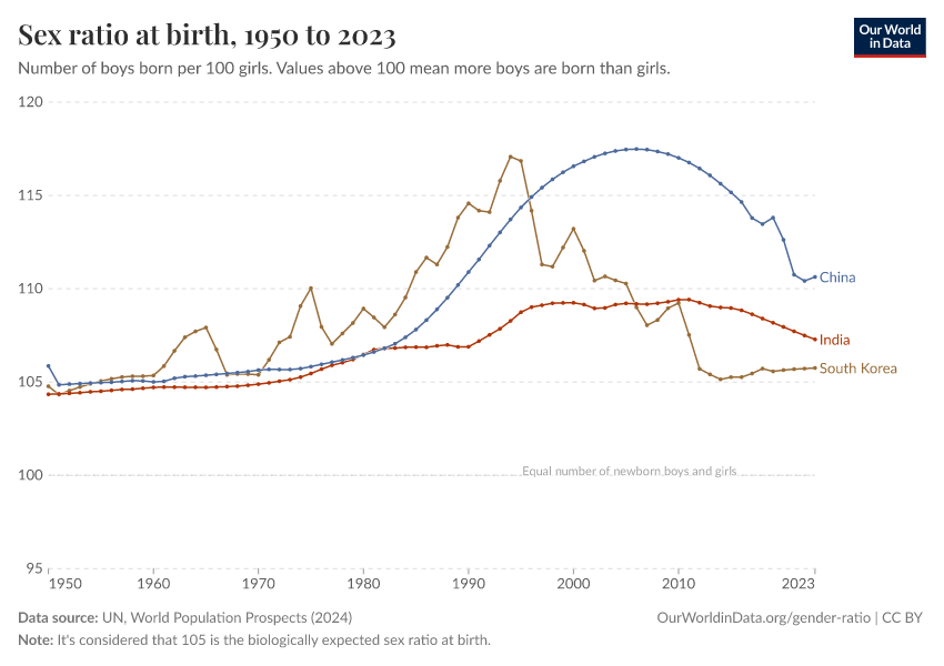 This is what the World Health Organization (WHO) considers the "expected sex ratio at birth”, which means that, in the absence of gender discrimination or interference, it’s expected that there would be around 105 boys born per 100 girls — although this can range from around 103 to 107 boys per 100 girls.