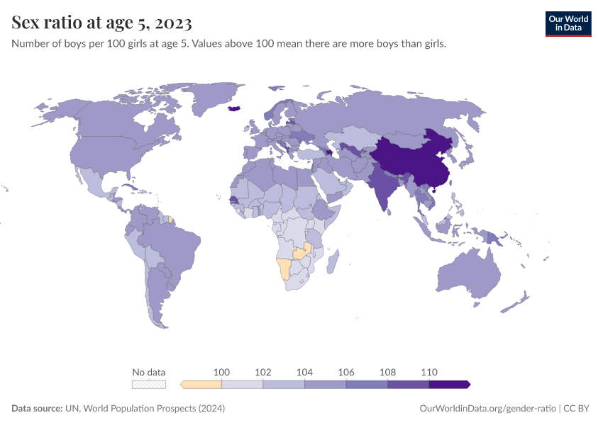 The map below shows the sex ratio among five-year-olds across the world. Just as with the sex ratio at birth, we see the highest ratios in several Asian countries, where the share of boys is higher than we would expect.