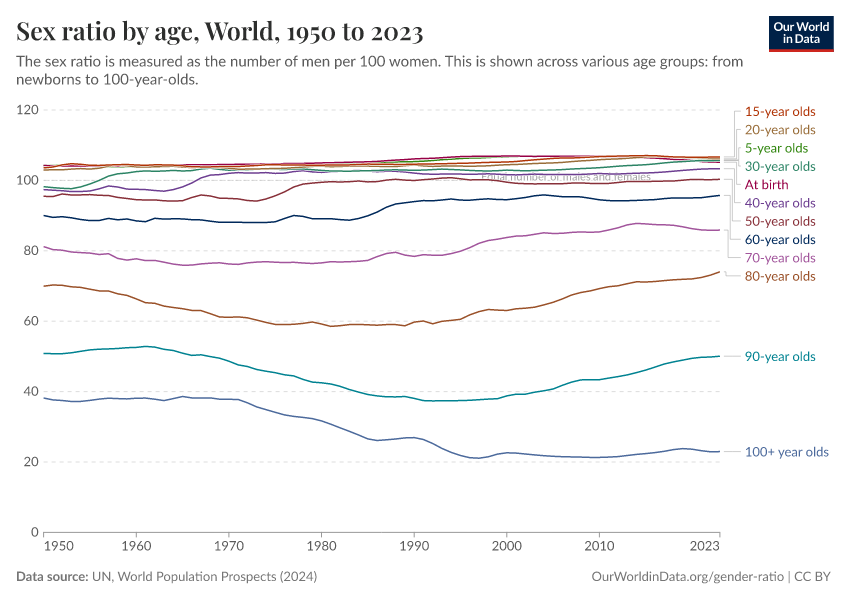 But as we move through adulthood, the sex ratio declines. In 2021, among 50-year-olds the ratio was close to 100. Among 70-year-olds, there were only 86 men per 100 women. In the very oldest age bracket, people aged 100 and older, there were only 24 men per 100 women.