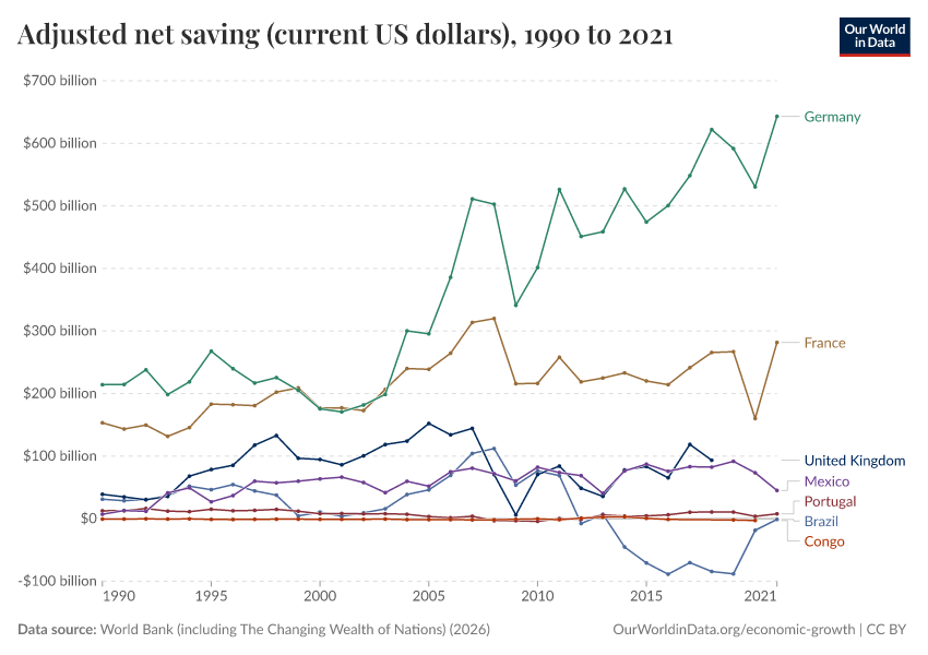 “Data Page: Adjusted net saving (current US dollars)”. Our World in Data (2026). Data adapted from World Bank (including The Changing Wealth of Nations). Retrieved from https://chart-preview-extension.owid.pages.dev:8789/20260202-181317/grapher/adjusted-net-saving-current-us-dollars.html [online resource] (archived on February 2, 2026).How to cite this data