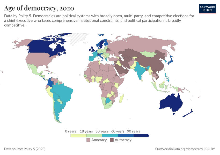 Polity 5 (2020) – processed by Our World in Data. “Age of democracy” [dataset]. Polity 5, “Polity5 Project, Political Regime Characteristics and Transitions, 1800-2018 5” [original data]. Retrieved February 12, 2026 from https://chart-preview-extension.owid.pages.dev:8789/20250909-093708/grapher/age-of-democracy-polity.html (archived on September 9, 2025).