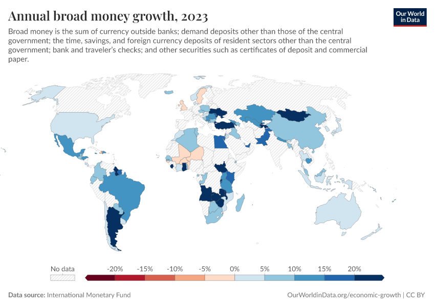 International Monetary Fund – processed by Our World in Data. “Annual broad money growth” [dataset]. International Monetary Fund, “International Monetary Fund, International Financial Statistics and data files.” [original data]. Retrieved February 12, 2026 from https://chart-preview-extension.owid.pages.dev:8789/20251120-211749/grapher/annual-broad-money-growth.html (archived on November 20, 2025).