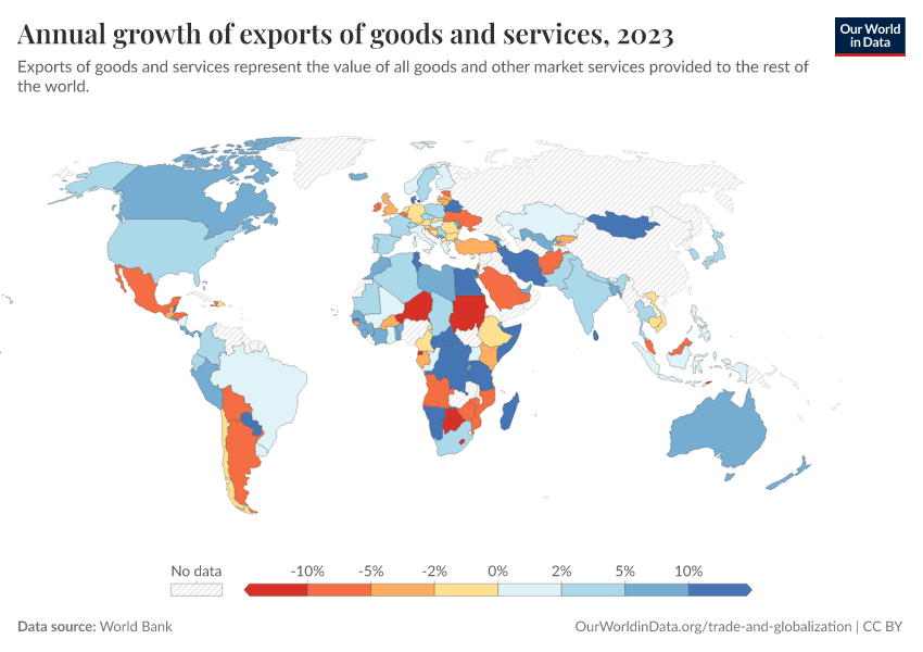 “Data Page: Annual growth of exports of goods and services”. Our World in Data (2026). Data adapted from World Bank. Retrieved from https://chart-preview-extension.owid.pages.dev:8789/20260130-180113/grapher/annual-growth-of-exports-of-goods-and-services.html [online resource] (archived on January 30, 2026).How to cite this data