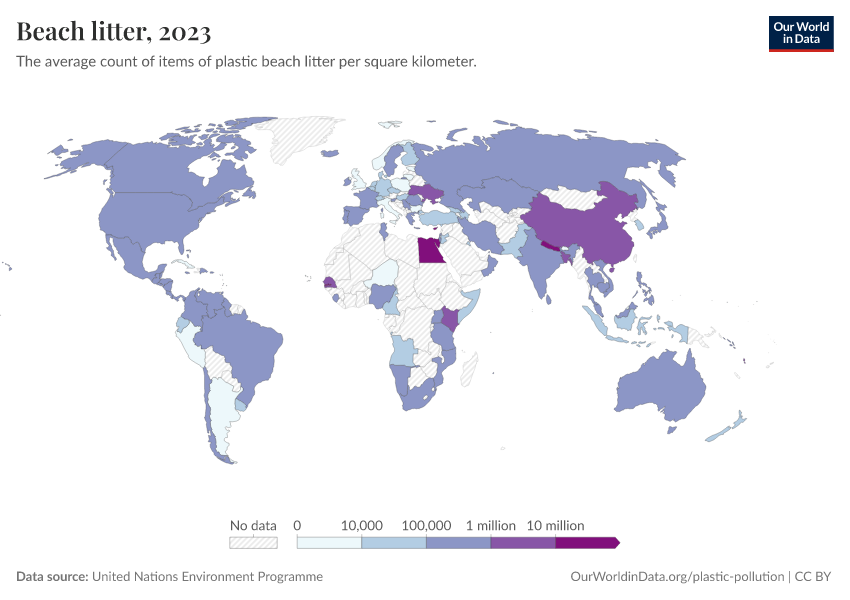 “Data Page: Beach litter”. Our World in Data (2026). Data adapted from United Nations Environment Programme. Retrieved from https://chart-preview-extension.owid.pages.dev:8789/20260105-133053/grapher/beach-litter.html [online resource] (archived on January 5, 2026).How to cite this data