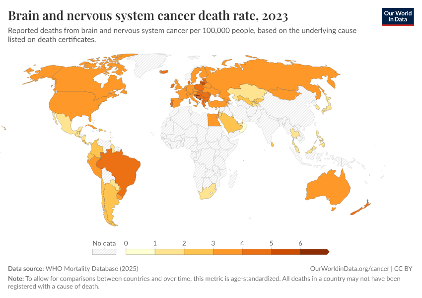 “Data Page: Brain and nervous system cancer death rate”, part of the following publication: Saloni Dattani, Fiona Spooner, Hannah Ritchie, and Max Roser (2023) - “Causes of Death”. Data adapted from WHO Mortality Database. Retrieved from https://chart-preview-extension.owid.pages.dev:8789/20250909-093708/grapher/brain-and-nervous-system-cancer-death-rate.html [online resource] (archived on September 9, 2025).How to cite this data