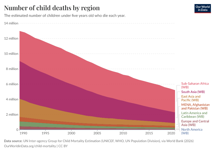 UN Inter-agency Group for Child Mortality Estimation (UNICEF, WHO, UN Population Division), via World Bank (2026) – processed by Our World in Data. “Number of child deaths by region” [dataset]. UN Inter-agency Group for Child Mortality Estimation (UNICEF, WHO, UN Population Division), via World Bank, “World Development Indicators 125” [original data]. Retrieved February 12, 2026 from https://chart-preview-extension.owid.pages.dev:8789/20260202-180243/grapher/child-deaths-igme-data.html (archived on February 2, 2026).