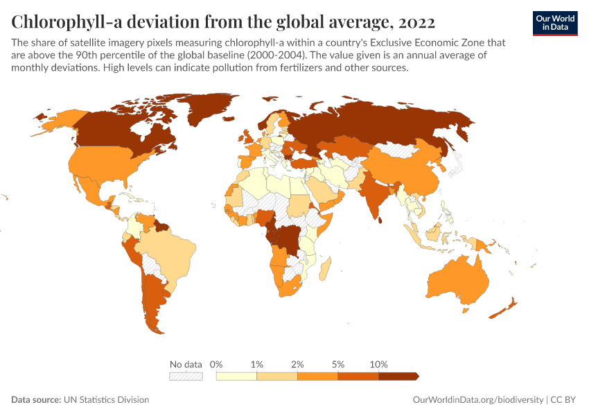 “Data Page: Chlorophyll-a deviation from the global average”. Our World in Data (2026). Data adapted from UN Statistics Division. Retrieved from https://chart-preview-extension.owid.pages.dev:8789/20260130-180113/grapher/chlorophyll-a-deviation-from-the-global-average.html [online resource] (archived on January 30, 2026).How to cite this data