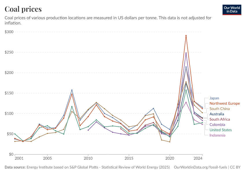 Energy Institute based on S&P Global Platts - Statistical Review of World Energy (2025) – with major processing by Our World in Data. “Coal prices” [dataset]. Energy Institute, “Statistical Review of World Energy” [original data]. Retrieved February 12, 2026 from https://chart-preview-extension.owid.pages.dev:8789/20250909-093708/grapher/coal-prices.html (archived on September 9, 2025).