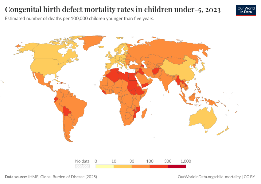 “Data Page: Congenital birth defect mortality rates in children under-5”, part of the following publication: Esteban Ortiz-Ospina and Max Roser (2016) - “Global Health”. Data adapted from IHME, Global Burden of Disease. Retrieved from https://chart-preview-extension.owid.pages.dev:8789/20260211-174736/grapher/congenital-birth-defect-mortality-rates-in-children-under-5.html [online resource] (archived on February 11, 2026).How to cite this data
