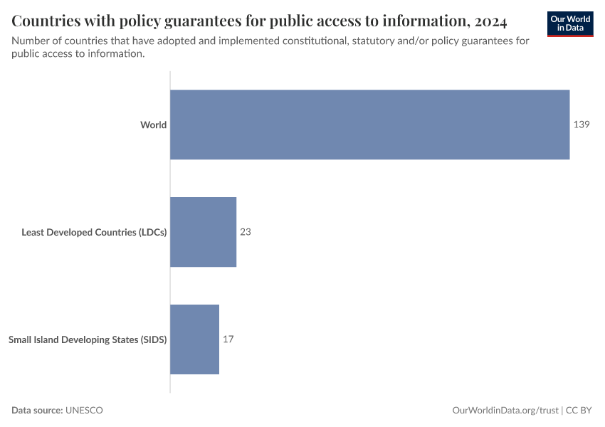 “Data Page: Countries with policy guarantees for public access to information”. Our World in Data (2026). Data adapted from UNESCO. Retrieved from https://chart-preview-extension.owid.pages.dev:8789/20260130-180113/grapher/countries-that-adopt-guarantees-for-public-access-to-information.html [online resource] (archived on January 30, 2026).How to cite this data