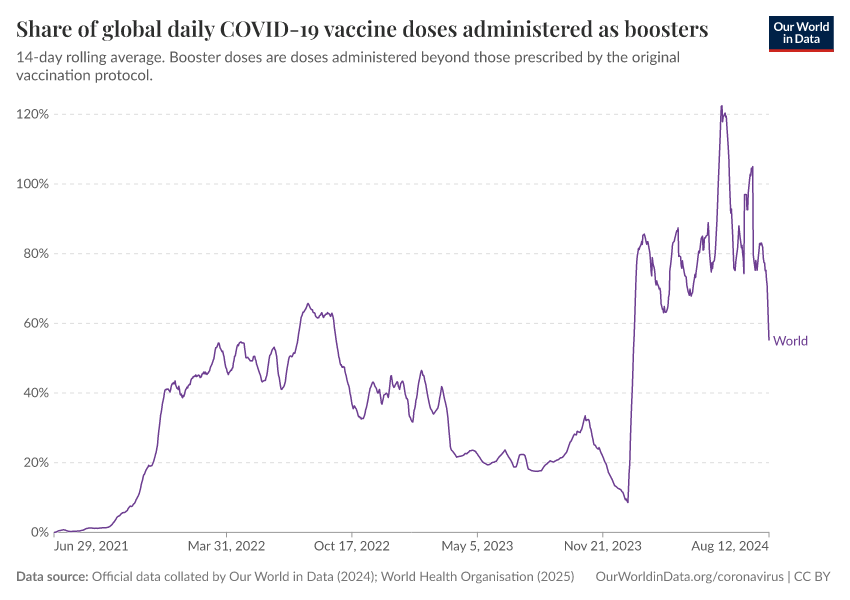 Official data collated by Our World in Data (2024); World Health Organisation (2025) – with major processing by Our World in Data. “Share of global daily COVID-19 vaccine doses administered as boosters” [dataset]. Official data collated by Our World in Data, “COVID-19, vaccinations”; World Health Organisation, “COVID-19, vaccinations (WHO)” [original data]. Retrieved February 12, 2026 from https://chart-preview-extension.owid.pages.dev:8789/20250909-093708/grapher/covid-vaccine-share-boosters.html (archived on September 9, 2025).