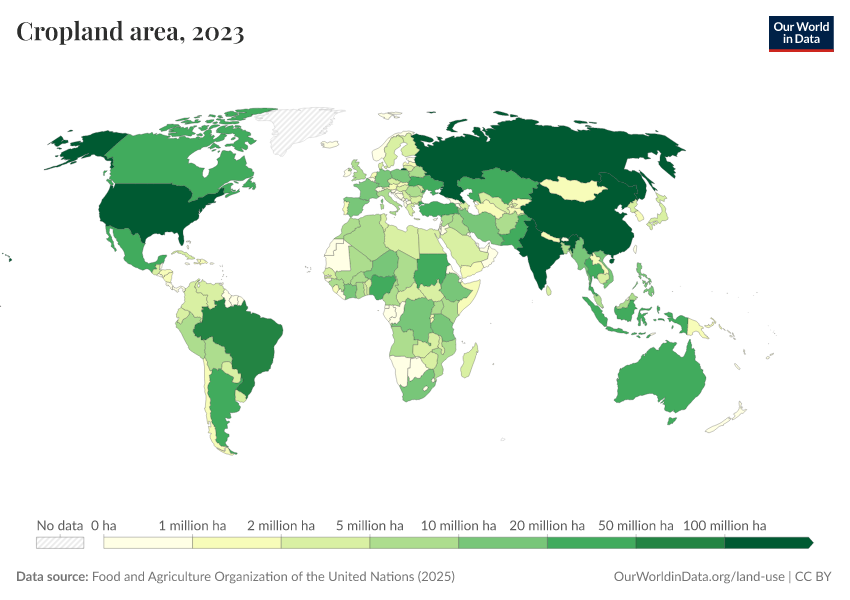“Data Page: Cropland area”, part of the following publication: Hannah Ritchie, Pablo Rosado, and Max Roser (2023) - “Agricultural Production”. Data adapted from Food and Agriculture Organization of the United Nations. Retrieved from https://chart-preview-extension.owid.pages.dev:8789/20260119-235736/grapher/cropland-area.html [online resource] (archived on January 19, 2026).How to cite this data