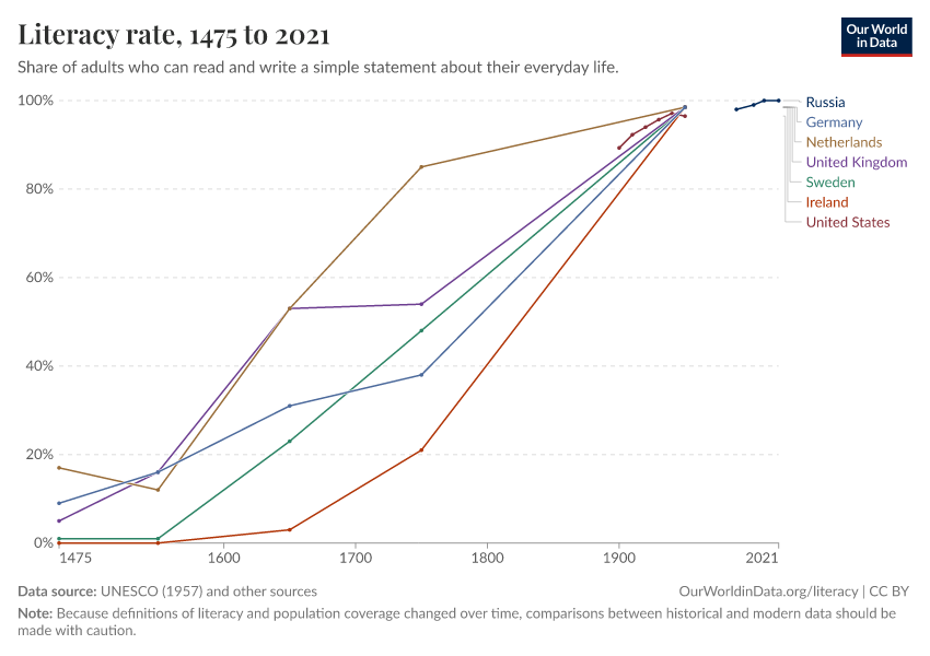 • However, measuring literacy over time is difficult, as definitions of what it means to be “literate” have varied widely across countries and historical periods. As a result, comparisons should be made with caution.
