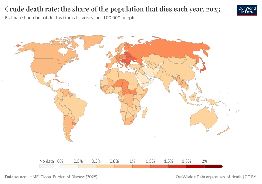 IHME, Global Burden of Disease (2025) – with major processing by Our World in Data. “Crude death rate: the share of the population that dies each year” [dataset]. IHME, Global Burden of Disease, “Global Burden of Disease - Deaths” [original data]. Retrieved February 12, 2026 from https://chart-preview-extension.owid.pages.dev:8789/20260211-174736/grapher/crude-death-rate-the-share-of-the-population-that-dies-each-year-gbd.html (archived on February 11, 2026).