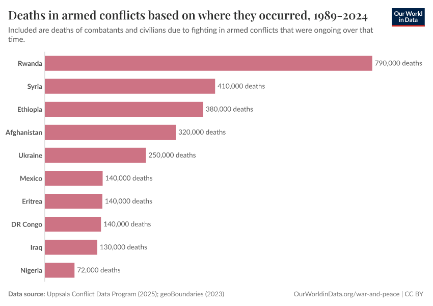 “Data Page: Deaths in armed conflicts based on where they occurred, 1989-2024”. Our World in Data (2026). Data adapted from Uppsala Conflict Data Program, Natural Earth. Retrieved from https://chart-preview-extension.owid.pages.dev:8789/20250909-093708/grapher/cumulative-deaths-in-armed-conflicts.html [online resource] (archived on September 9, 2025).