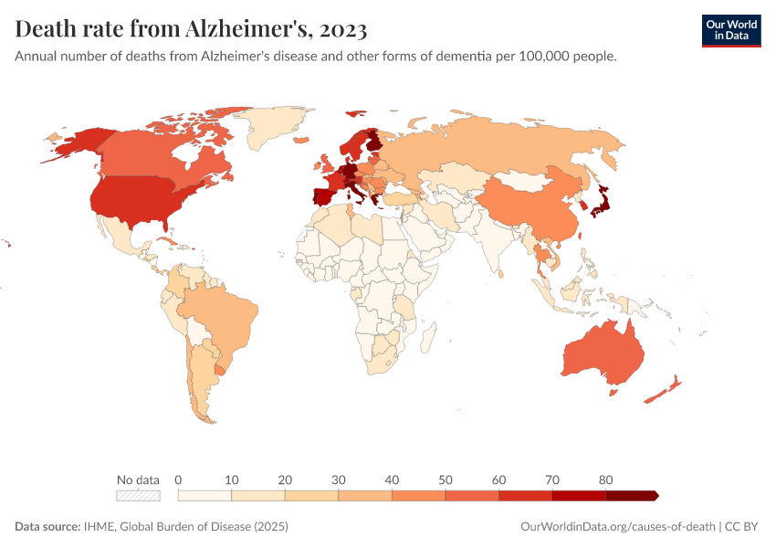 IHME, Global Burden of Disease (2025) – with major processing by Our World in Data. “Death rate from Alzheimer's” [dataset]. IHME, Global Burden of Disease, “Global Burden of Disease - Deaths” [original data]. Retrieved February 12, 2026 from https://chart-preview-extension.owid.pages.dev:8789/20260211-174736/grapher/death-rate-from-alzheimers-other-dementias-gbd.html (archived on February 11, 2026).