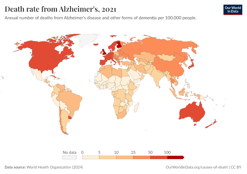 World Health Organization (2024) – with major processing by Our World in Data. “Death rate from Alzheimer's” [dataset]. World Health Organization, “Global Health Estimates” [original data]. Retrieved February 12, 2026 from https://chart-preview-extension.owid.pages.dev:8789/20250909-093708/grapher/death-rate-from-alzheimers-other-dementias-ghe.html (archived on September 9, 2025).
