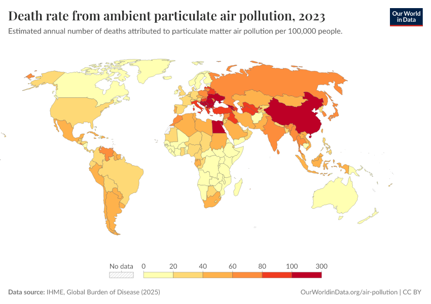 IHME, Global Burden of Disease (2024) – with minor processing by Our World in Data. “Death rate from ambient particulate air pollution” [dataset]. IHME, Global Burden of Disease, “Global Burden of Disease - Risk Factors” [original data]. Retrieved February 12, 2026 from https://chart-preview-extension.owid.pages.dev:8789/20250909-093708/grapher/death-rate-from-ambient-particulate-air-pollution.html (archived on September 9, 2025).