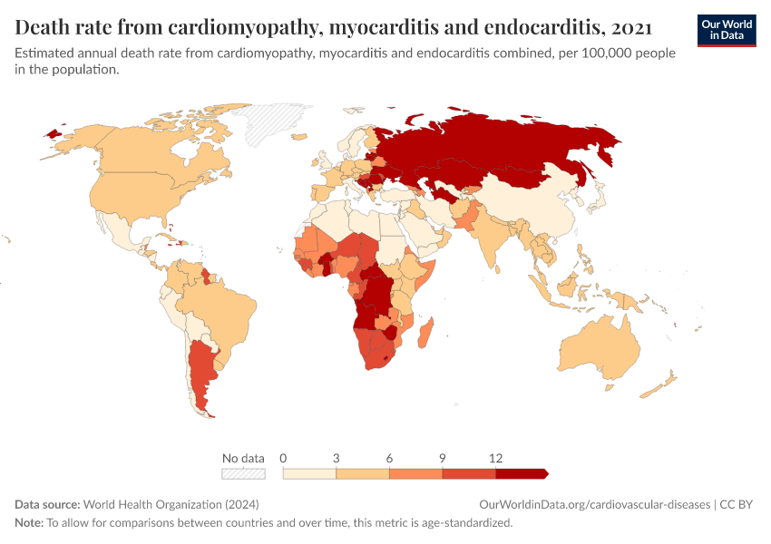 World Health Organization (2024) – with major processing by Our World in Data. “Death rate from cardiomyopathy, myocarditis and endocarditis” [dataset]. World Health Organization, “Global Health Estimates” [original data]. Retrieved February 12, 2026 from https://chart-preview-extension.owid.pages.dev:8789/20250909-093708/grapher/death-rate-from-cardiomyopathy-myocarditis-endocarditis-who-ghe-age-standardized.html (archived on September 9, 2025).
