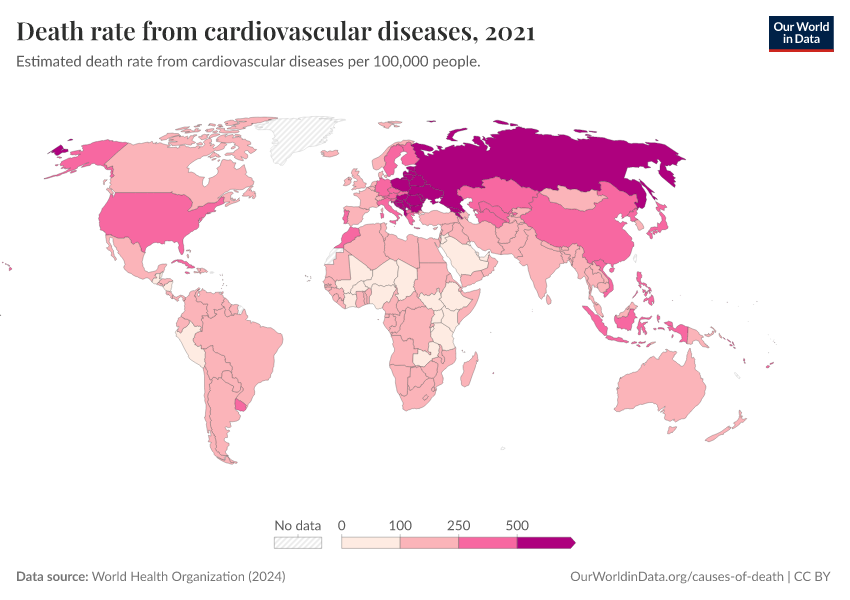 World Health Organization (2024) – with major processing by Our World in Data. “Death rate from cardiovascular diseases” [dataset]. World Health Organization, “Global Health Estimates” [original data]. Retrieved February 12, 2026 from https://chart-preview-extension.owid.pages.dev:8789/20250909-093708/grapher/death-rate-from-cardiovascular-disease-ghe.html (archived on September 9, 2025).