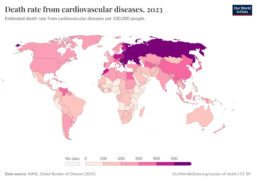 IHME, Global Burden of Disease (2025) – with major processing by Our World in Data. “Death rate from cardiovascular diseases” [dataset]. IHME, Global Burden of Disease, “Global Burden of Disease - Deaths” [original data]. Retrieved February 12, 2026 from https://chart-preview-extension.owid.pages.dev:8789/20260211-174736/grapher/death-rate-from-cardiovascular-diseases.html (archived on February 11, 2026).