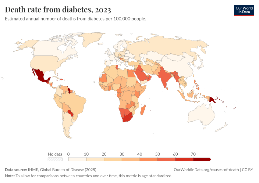 IHME, Global Burden of Disease (2025) – with major processing by Our World in Data. “Death rate from diabetes” [dataset]. IHME, Global Burden of Disease, “Global Burden of Disease - Deaths” [original data]. Retrieved February 12, 2026 from https://chart-preview-extension.owid.pages.dev:8789/20260211-174736/grapher/death-rate-from-diabetes.html (archived on February 11, 2026).