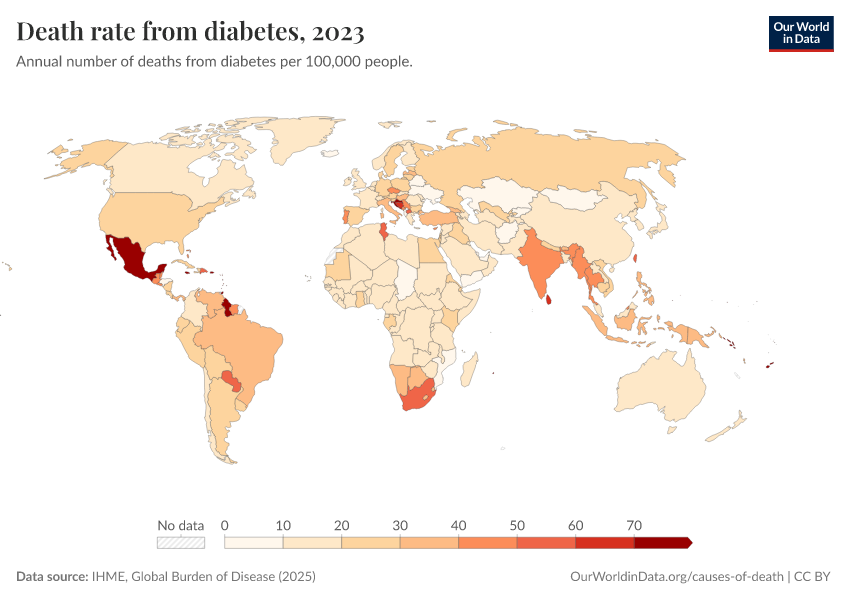IHME, Global Burden of Disease (2025) – with major processing by Our World in Data. “Death rate from diabetes” [dataset]. IHME, Global Burden of Disease, “Global Burden of Disease - Deaths” [original data]. Retrieved February 12, 2026 from https://chart-preview-extension.owid.pages.dev:8789/20260211-174736/grapher/death-rate-from-diabetes-gbd.html (archived on February 11, 2026).