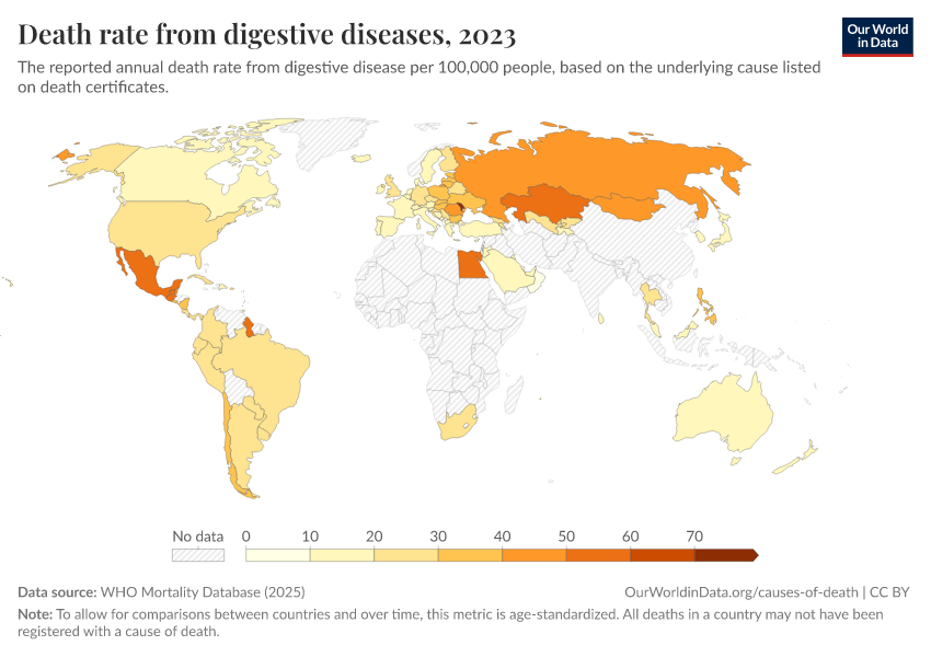 “Data Page: Death rate from digestive diseases”, part of the following publication: Saloni Dattani, Fiona Spooner, Hannah Ritchie, and Max Roser (2023) - “Causes of Death”. Data adapted from WHO Mortality Database. Retrieved from https://chart-preview-extension.owid.pages.dev:8789/20250909-093708/grapher/death-rate-from-digestive-diseases-who-mdb.html [online resource] (archived on September 9, 2025).How to cite this data