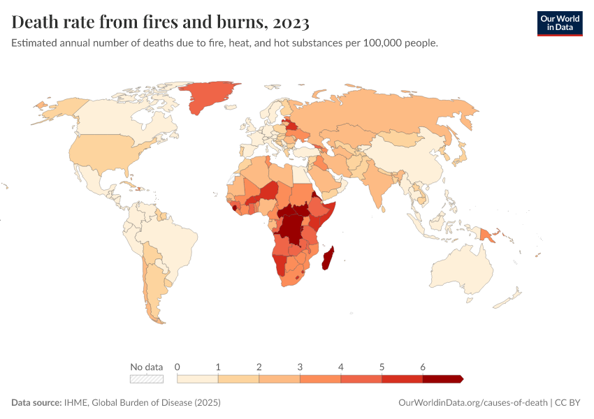 IHME, Global Burden of Disease (2025) – with major processing by Our World in Data. “Death rate from fires and burns” [dataset]. IHME, Global Burden of Disease, “Global Burden of Disease - Deaths” [original data]. Retrieved February 12, 2026 from https://chart-preview-extension.owid.pages.dev:8789/20260211-174736/grapher/death-rate-from-fires-and-burns-ihme.html (archived on February 11, 2026).