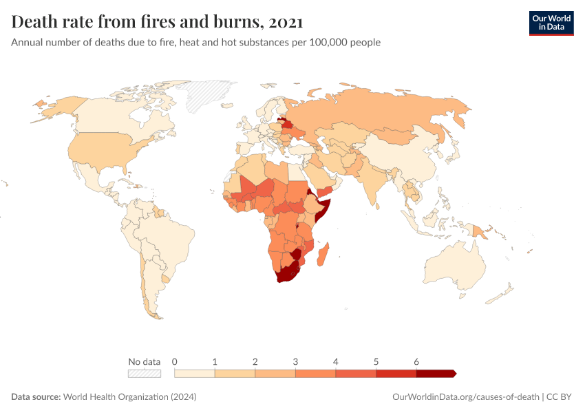 World Health Organization (2024) – with major processing by Our World in Data. “Death rate from fires and burns” [dataset]. World Health Organization, “Global Health Estimates” [original data]. Retrieved February 12, 2026 from https://chart-preview-extension.owid.pages.dev:8789/20250909-093708/grapher/death-rate-from-fires-and-burns-who.html (archived on September 9, 2025).