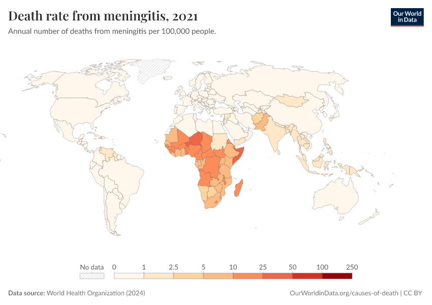 “Data Page: Death rate from meningitis”, part of the following publication: Esteban Ortiz-Ospina and Max Roser (2016) - “Global Health”. Data adapted from World Health Organization. Retrieved from https://chart-preview-extension.owid.pages.dev:8789/20250909-093708/grapher/death-rate-from-meningitis-who.html [online resource] (archived on September 9, 2025).How to cite this data