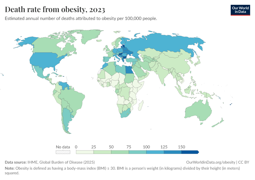 IHME, Global Burden of Disease (2024) – with minor processing by Our World in Data. “Death rate from obesity” [dataset]. IHME, Global Burden of Disease, “Global Burden of Disease - Risk Factors” [original data]. Retrieved February 12, 2026 from https://chart-preview-extension.owid.pages.dev:8789/20250909-093708/grapher/death-rate-from-obesity-gbd.html (archived on September 9, 2025).