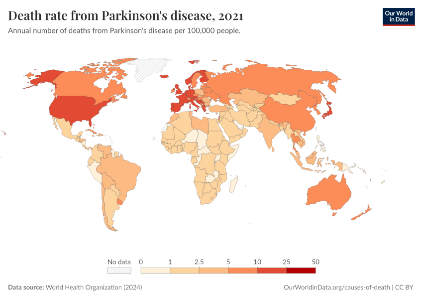 World Health Organization (2024) – with major processing by Our World in Data. “Death rate from Parkinson's disease” [dataset]. World Health Organization, “Global Health Estimates” [original data]. Retrieved February 12, 2026 from https://chart-preview-extension.owid.pages.dev:8789/20250909-093708/grapher/death-rate-from-parkinsons-disease-ghe.html (archived on September 9, 2025).