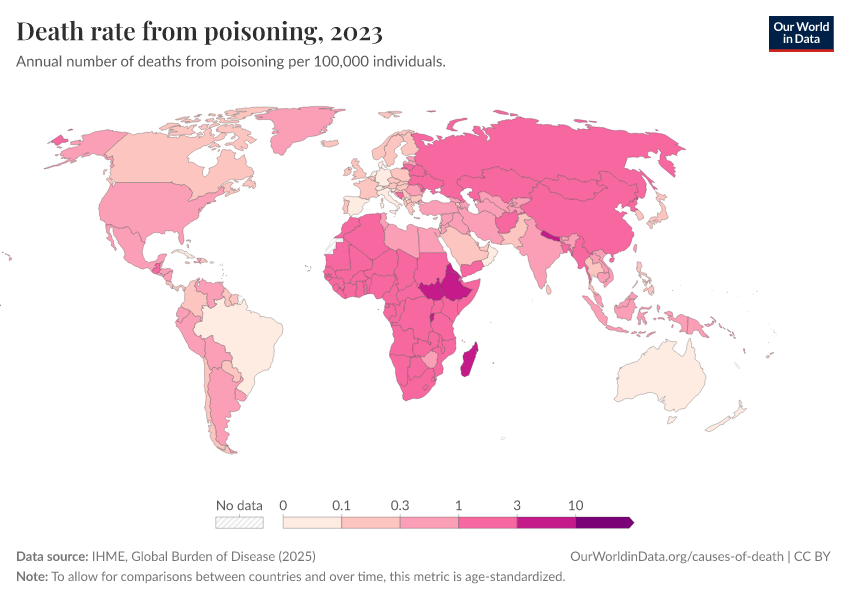 IHME, Global Burden of Disease (2025) – with major processing by Our World in Data. “Death rate from poisoning” [dataset]. IHME, Global Burden of Disease, “Global Burden of Disease - Deaths” [original data]. Retrieved February 12, 2026 from https://chart-preview-extension.owid.pages.dev:8789/20260211-174736/grapher/death-rate-from-poisoning.html (archived on February 11, 2026).