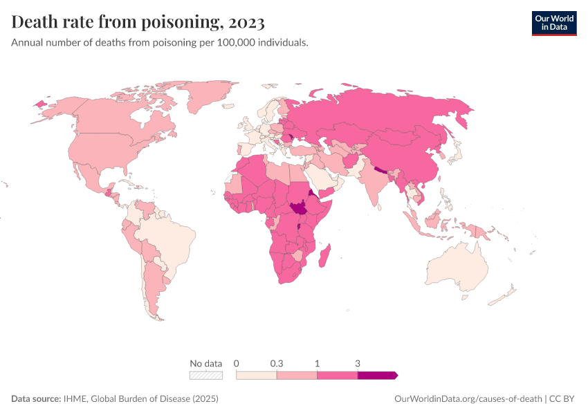 IHME, Global Burden of Disease (2025) – with major processing by Our World in Data. “Death rate from poisoning” [dataset]. IHME, Global Burden of Disease, “Global Burden of Disease - Deaths” [original data]. Retrieved February 12, 2026 from https://chart-preview-extension.owid.pages.dev:8789/20260211-174736/grapher/death-rate-from-poisoning-gbd.html (archived on February 11, 2026).