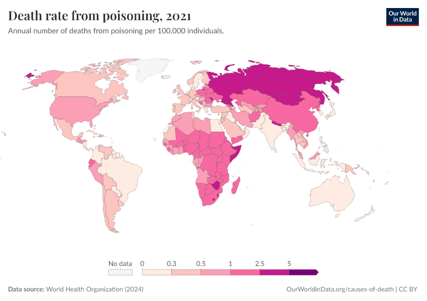 World Health Organization (2024) – with major processing by Our World in Data. “Death rate from poisoning” [dataset]. World Health Organization, “Global Health Estimates” [original data]. Retrieved February 12, 2026 from https://chart-preview-extension.owid.pages.dev:8789/20250909-093708/grapher/death-rate-from-poisoning-ghe.html (archived on September 9, 2025).