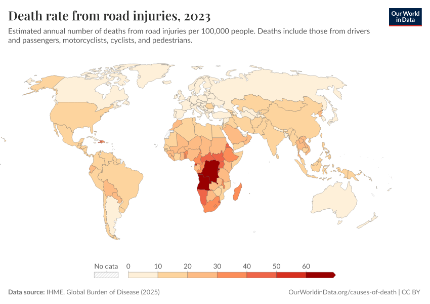 IHME, Global Burden of Disease (2025) – with major processing by Our World in Data. “Death rate from road injuries” [dataset]. IHME, Global Burden of Disease, “Global Burden of Disease - Deaths” [original data]. Retrieved February 12, 2026 from https://chart-preview-extension.owid.pages.dev:8789/20260211-174736/grapher/death-rate-from-road-accidents.html (archived on February 11, 2026).