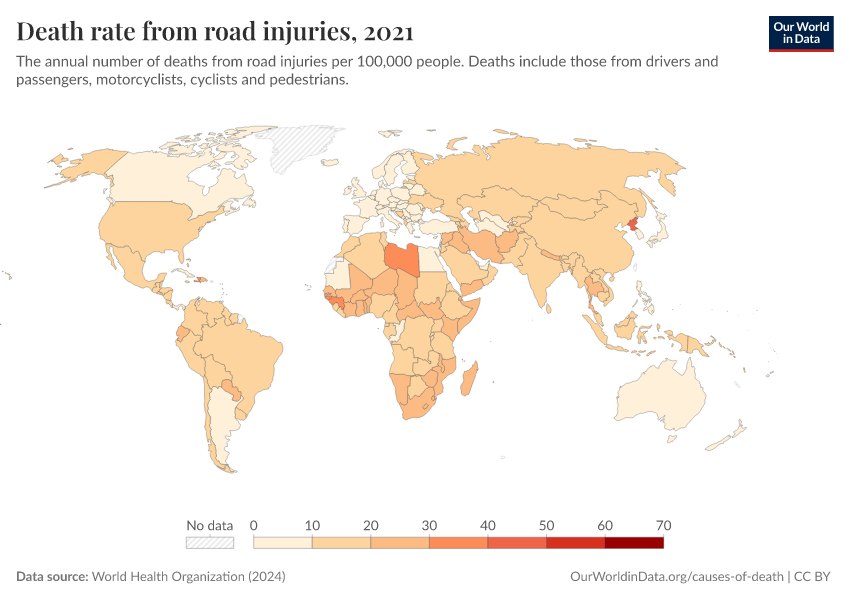 World Health Organization (2024) – with major processing by Our World in Data. “Death rate from road injuries” [dataset]. World Health Organization, “Global Health Estimates” [original data]. Retrieved February 12, 2026 from https://chart-preview-extension.owid.pages.dev:8789/20250909-093708/grapher/death-rate-from-road-accidents-ghe.html (archived on September 9, 2025).