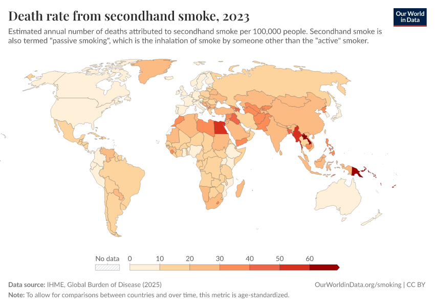 IHME, Global Burden of Disease (2024) – with minor processing by Our World in Data. “Death rate from secondhand smoke” [dataset]. IHME, Global Burden of Disease, “Global Burden of Disease - Risk Factors” [original data]. Retrieved February 12, 2026 from https://chart-preview-extension.owid.pages.dev:8789/20250909-093708/grapher/death-rate-from-secondhand-smoke.html (archived on September 9, 2025).