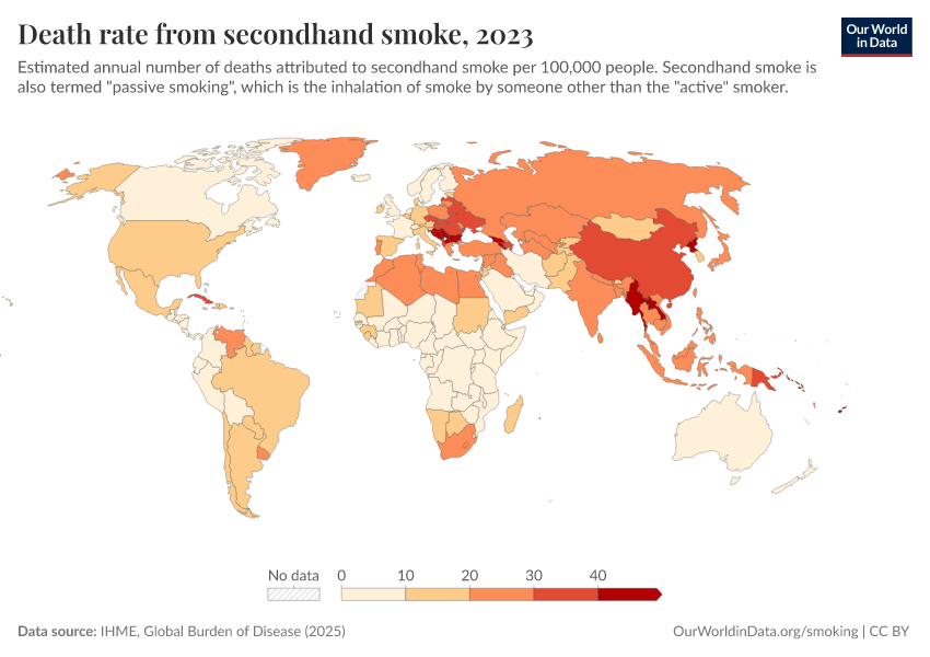 IHME, Global Burden of Disease (2024) – with minor processing by Our World in Data. “Death rate from secondhand smoke” [dataset]. IHME, Global Burden of Disease, “Global Burden of Disease - Risk Factors” [original data]. Retrieved February 12, 2026 from https://chart-preview-extension.owid.pages.dev:8789/20250909-093708/grapher/death-rate-from-secondhand-smoke-gbd.html (archived on September 9, 2025).